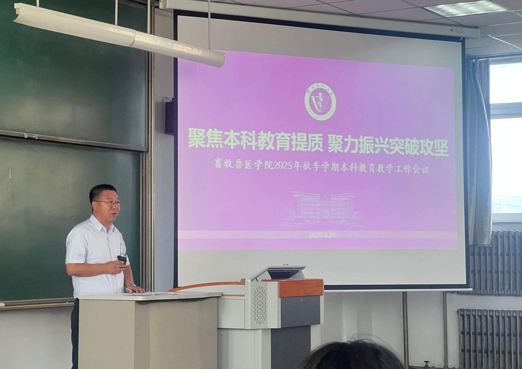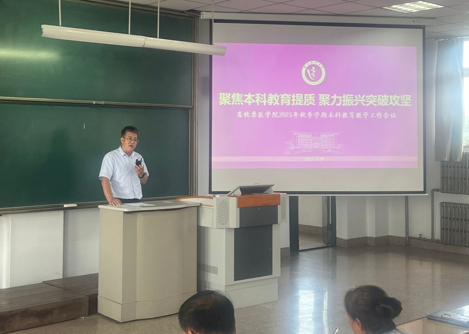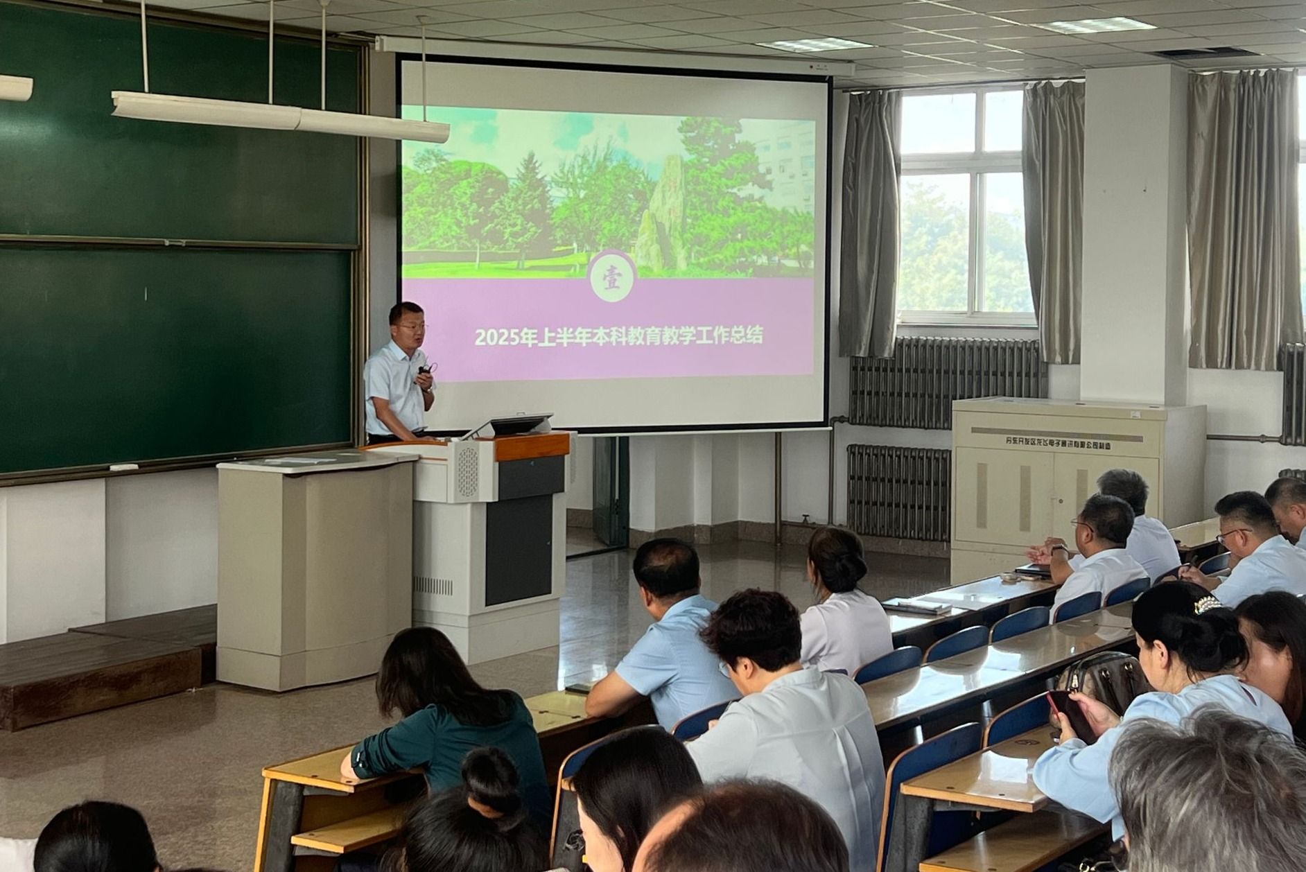 王春强副院长全面回顾了2025年上半年学校本科教育教学工作的开展情况,客观剖析了当前在专业建设、智慧化课程建设、课程思政以及教师教学能力等方面存在的不足。围绕“十四五”规划收官和全面振兴新突破三年行动的决胜目标,他对新学期教育教学工作提出明确要求:一是坚持立德树人根本任务,全面推进教育教学高质量发展,立足质量核心,扎实推进“十五五”人才培养专项规划编制,聚焦专业建设、课程改革、教学创新、创新创业教育及教师专业发展等重点领域,持续提升育人水平;二是强化责任意识,规范教学管理,注重细节落实,完成教学工作考核任务,深化教学改革,推进创新创业,对标整改、补齐短板,切实提升教育教学管理效能。